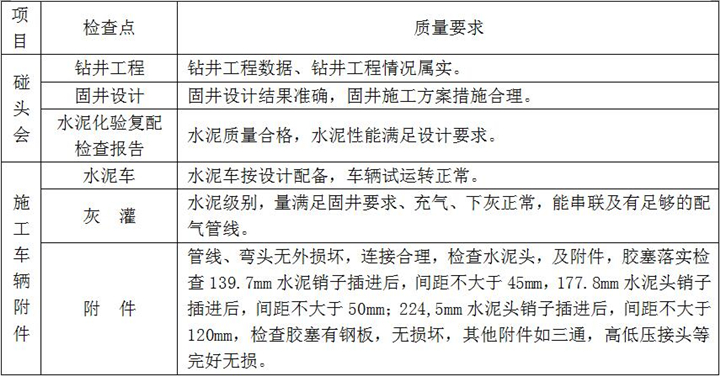 2、固井施工:按設(shè)計(jì)注入隔離液,水泥漿壓膠塞,頂替鉆井液、碰壓、試壓完成、固井施工過(guò)程檢查點(diǎn)項(xiàng)及要求如下: